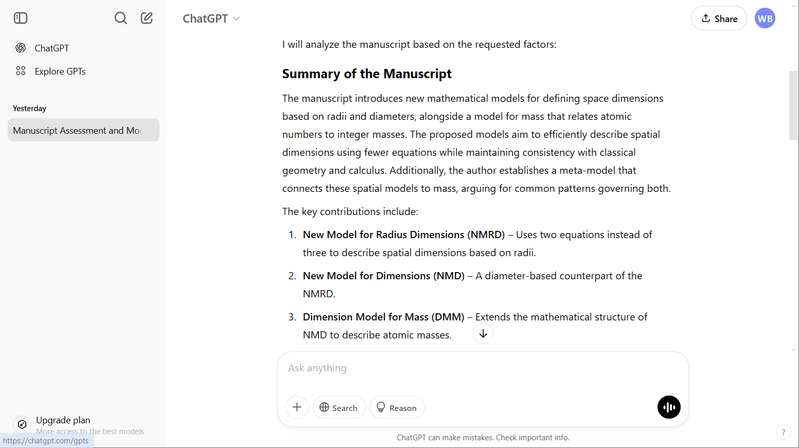 The Meta-Model for Space and Mass was verified by Chat GPT, too! Summary: "The manuscript presents mathematically consistent models that simplify and unify geometric and mass-related equations.".