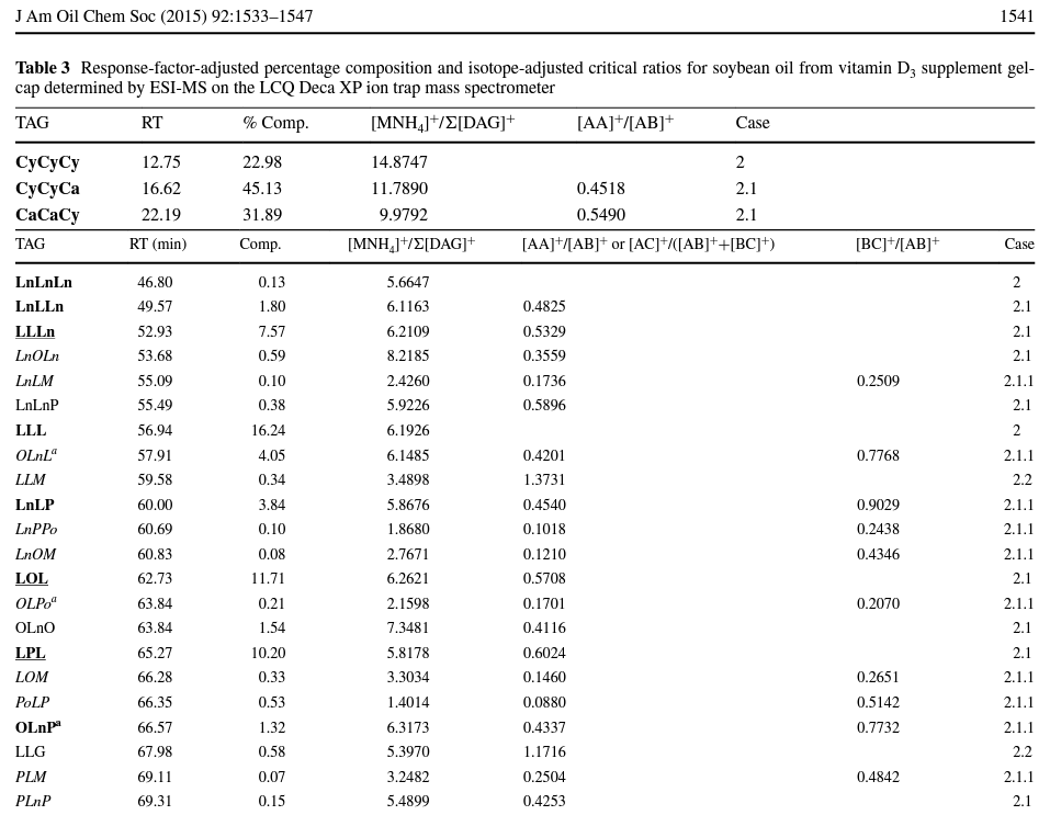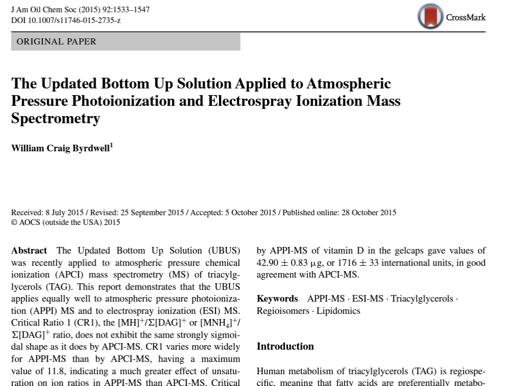 Byrdwell, W. C., "The Updated Bottom Up Solution Applied to Atmospheric Pressure Photoionization and Electrospray Ionization Mass Spectrometry", Journal of the American Oil Chemists' Society, 92(11):1533-1547 (2015), DOI: 10.1007/s11746-015-2735-z.