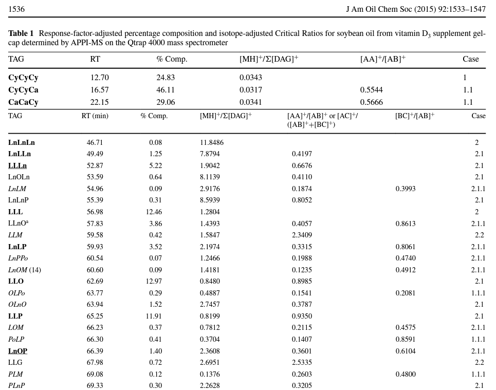 Byrdwell, W.C., "The Bottom Up Solution to the Triacylglycerol Lipidome Using Atmospheric Pressure Chemical Ionization Mass Spectrometry", Lipids, 40(4):383-417 (2005),