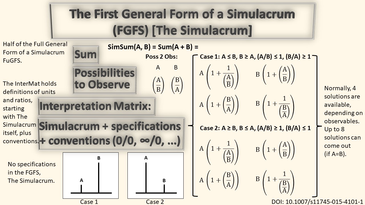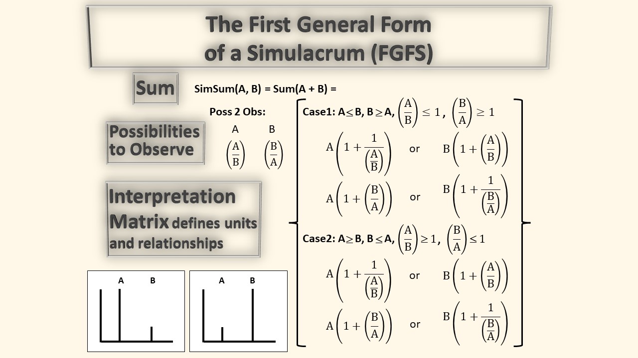 The application, the BUS, came first. It was generalized, and generalized again, and again, to The Simulacrum System. The Simulacrum System is so general it applies to everything with a written name, number, or symbol. A Simulacrum Sum is the sum of any two written values, expressed as a value and a ratio of the values. The meanings of the values and their relationship in the ratios are all defined in the Interpretation Matrix. The Interpretation Matrix ties thought to symbols, showing that the Simulacrum System is based on consciousness.